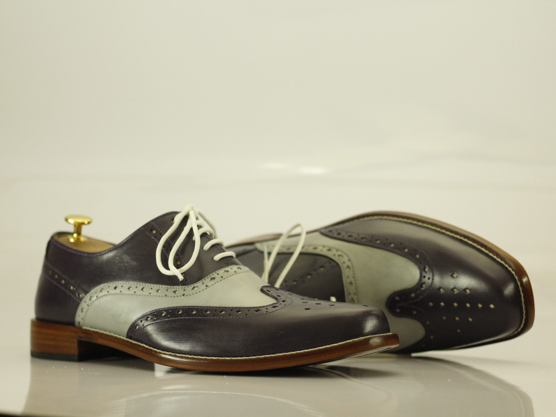 Handmade Men's Black & Gray Leather Wing Tip Brogue Dress Formal Lace Up Shoes