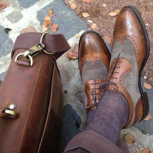 Handmade Brown & Grey Color Leather & Suede Wing Tip Brogue Shoes, Men's Dress Lace Up Shoes