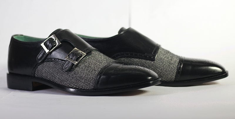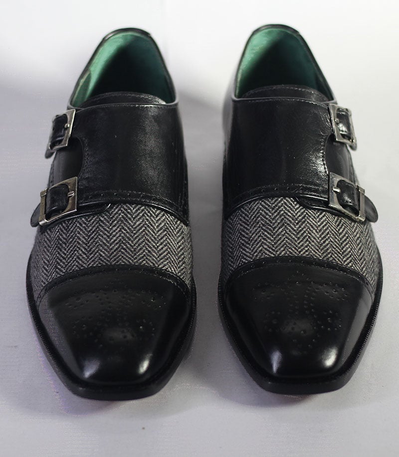Handmade Men's Black Leather & Tweed Cap Toe Brogue Double Monk Shoes