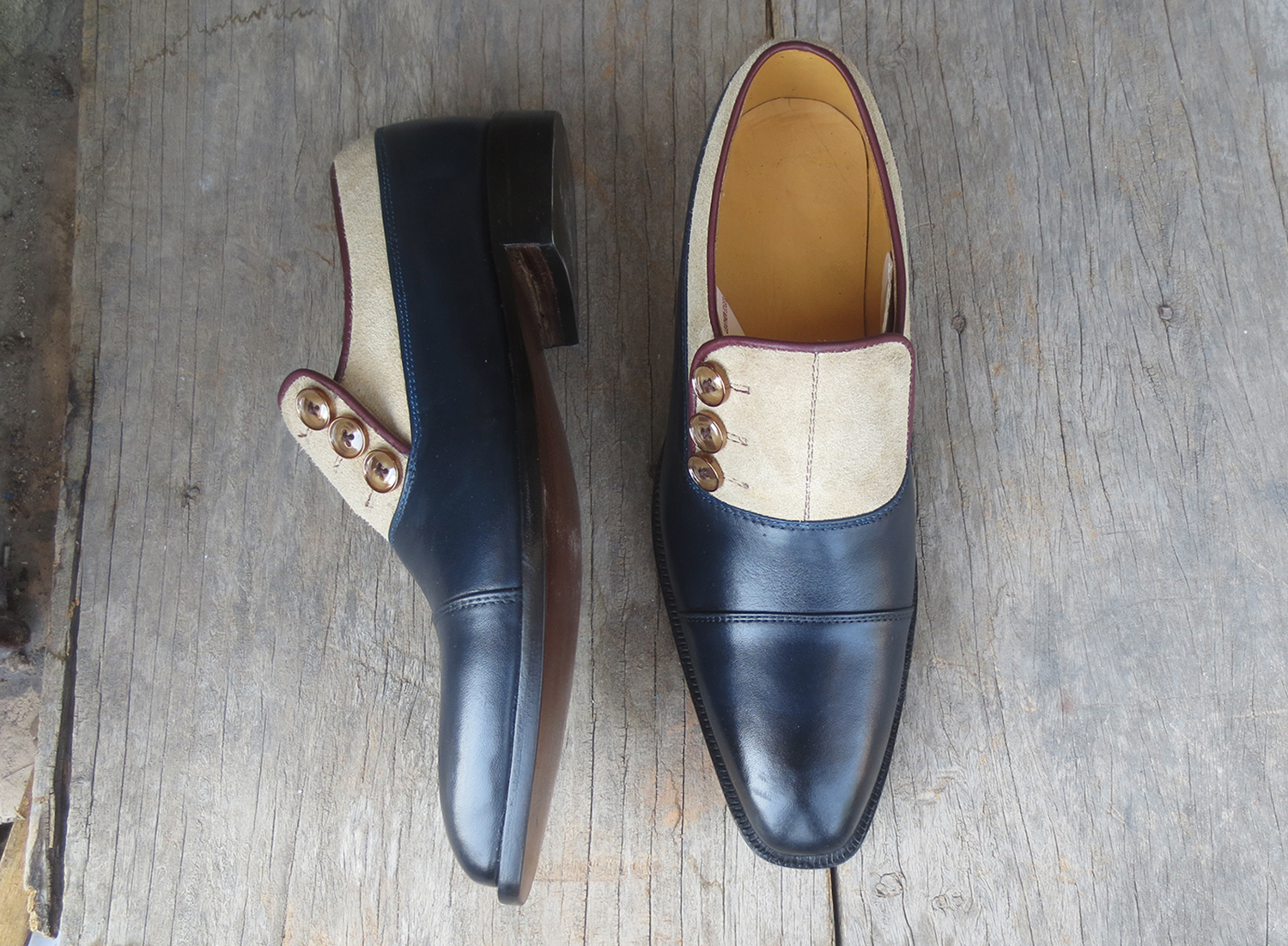 Handmade Men's Beige & Black Color Leather & Suede Cap Toe Button Dress Formal Shoes