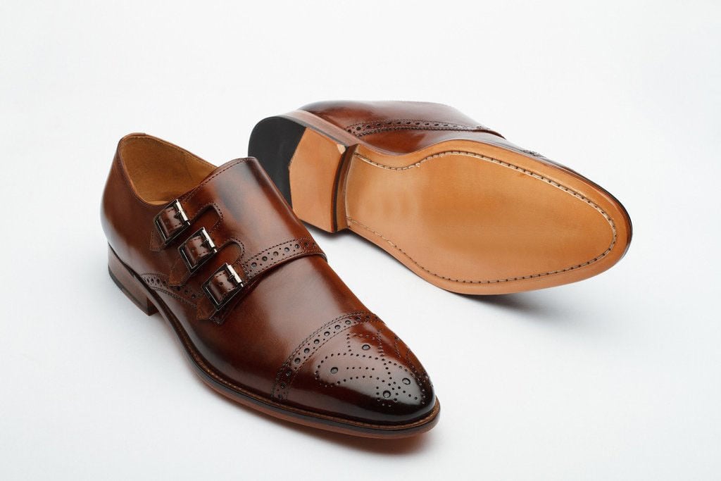 Handmade Men's Brown Color Leather Cap Toe Three Monk Strap Dress Formal Shoes