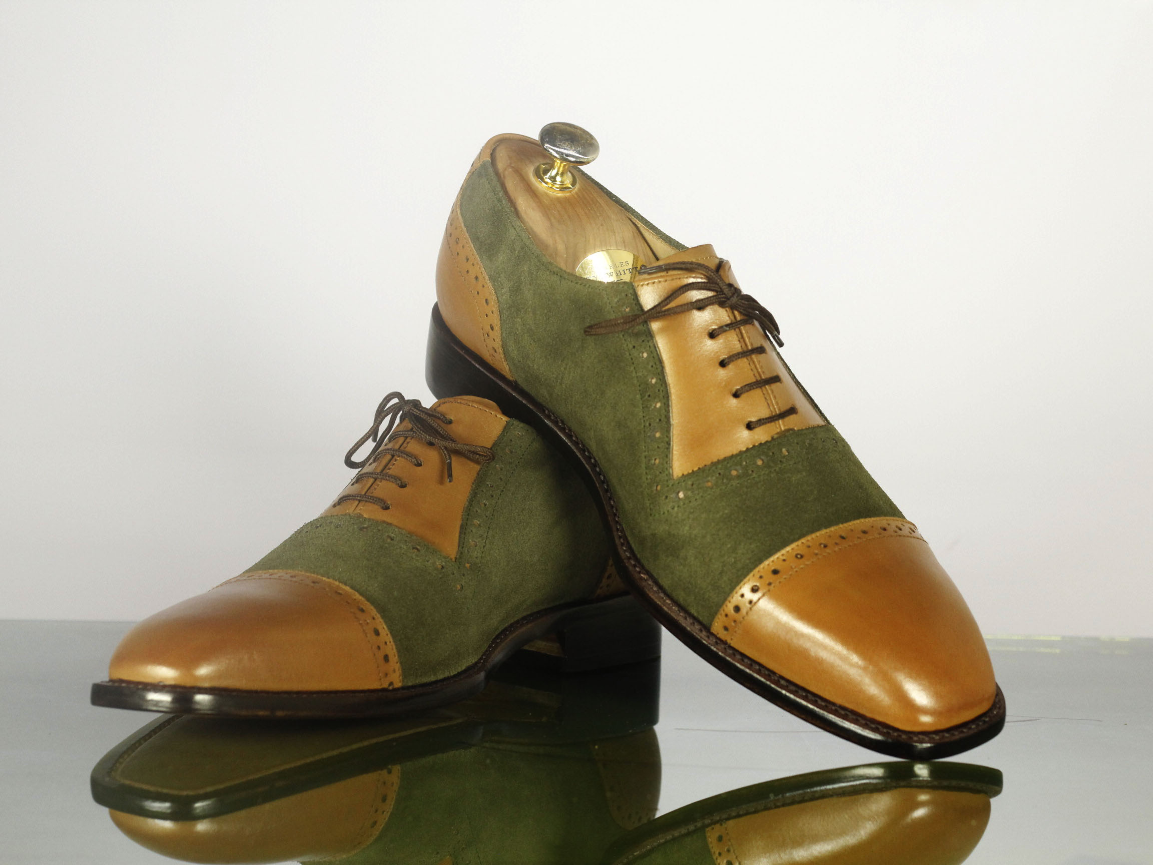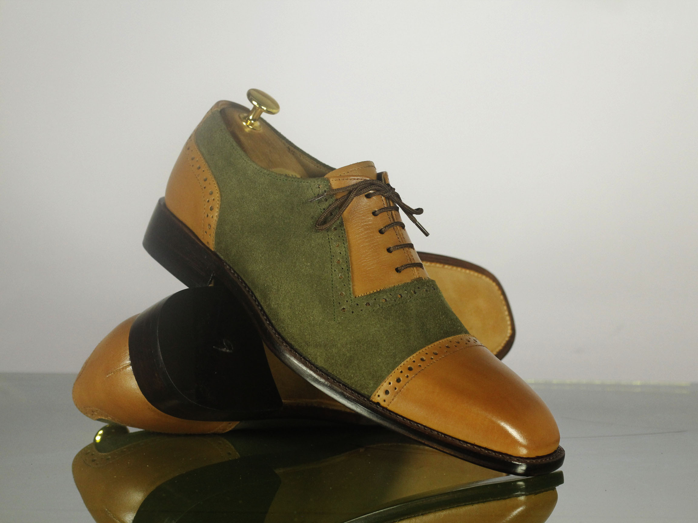 Handmade Men's Tan & Olive Green Color Suede & Leather Cap Toe Lace Up Dress Shoes