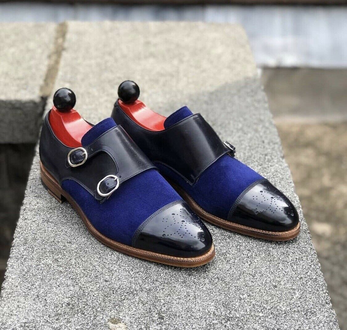 Handmade Royal Blue & Black Color Leather & Suede Double Monk Shoes, Men's Cap Toe Brogue Dress Shoes