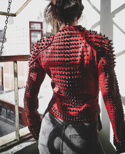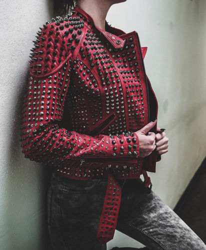 Handmade Women's Rock Punk Full Red Metal Studded Punk Cowhide Leather Jacket