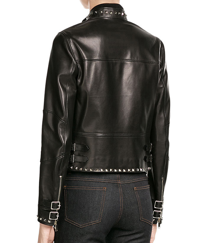 Handmade Women's Sliver Studded Zip Style Black Biker Rock Design Leather Jacket