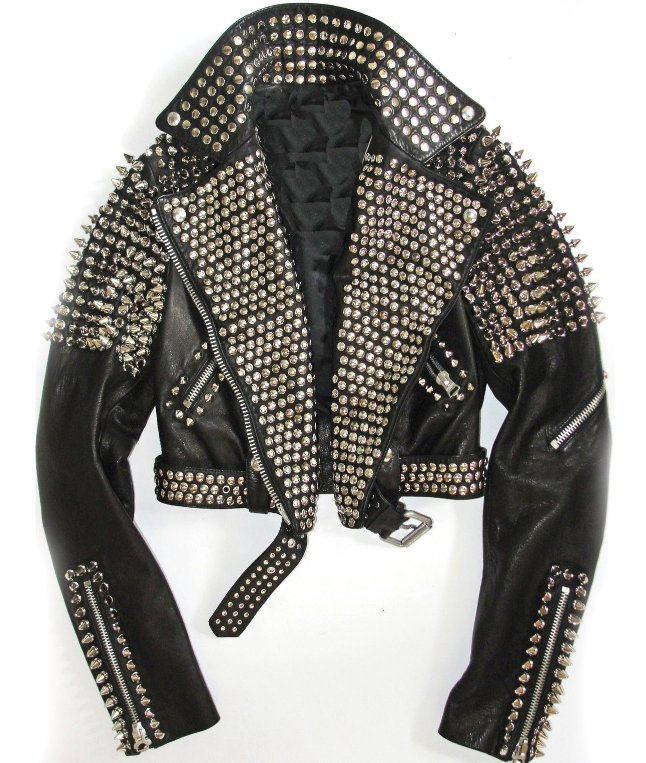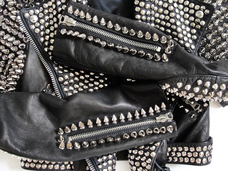 Any custom change you want is possible. Please send us message for further details. Studded Jacket made with 100 % Genuine Top Quality Cowhide Leather Golden Silver Studded the jacket is not real branded but same as shown in the picture High Quality Studs. Each securely added by hand Cropped, Vintage - Inspired Motorcycle / Moto / Biker Fit 0.9 to 1.0 MM Cowhide Leather used Polyester Inner Lining & inside Pocket Zipper details on Sleeves Soft Black Real Leather All Sizes Available Make sure to look at the size chart below before selecting your size. There can be slight difference between the original product and the pictures attached above in followings like: accessories, zipper or color shade and size Fit may differ from images due to every time new materials came . We can Offer you customized size/ customized design and Color Changes If you want we can write your Name or logo on the Jacket or on the Suit Size more then 3XL $20 will be charged and from 5XL, 6XL and custom size $35 please add into invoice before paying Shipping Service: We use DHL, Fedex, SKY NET and EMS Please note Buyer from Central & South America and Eastern Europe need to pay Extra Charges for shipping because shipping companies charge high for these destinations