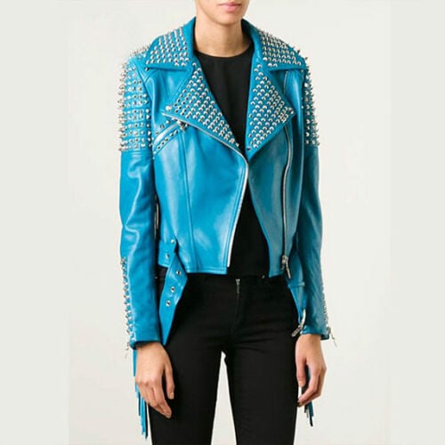 Handmade Woman Blue Punk Brando Spiked Studded Leather Fringes Jacket
