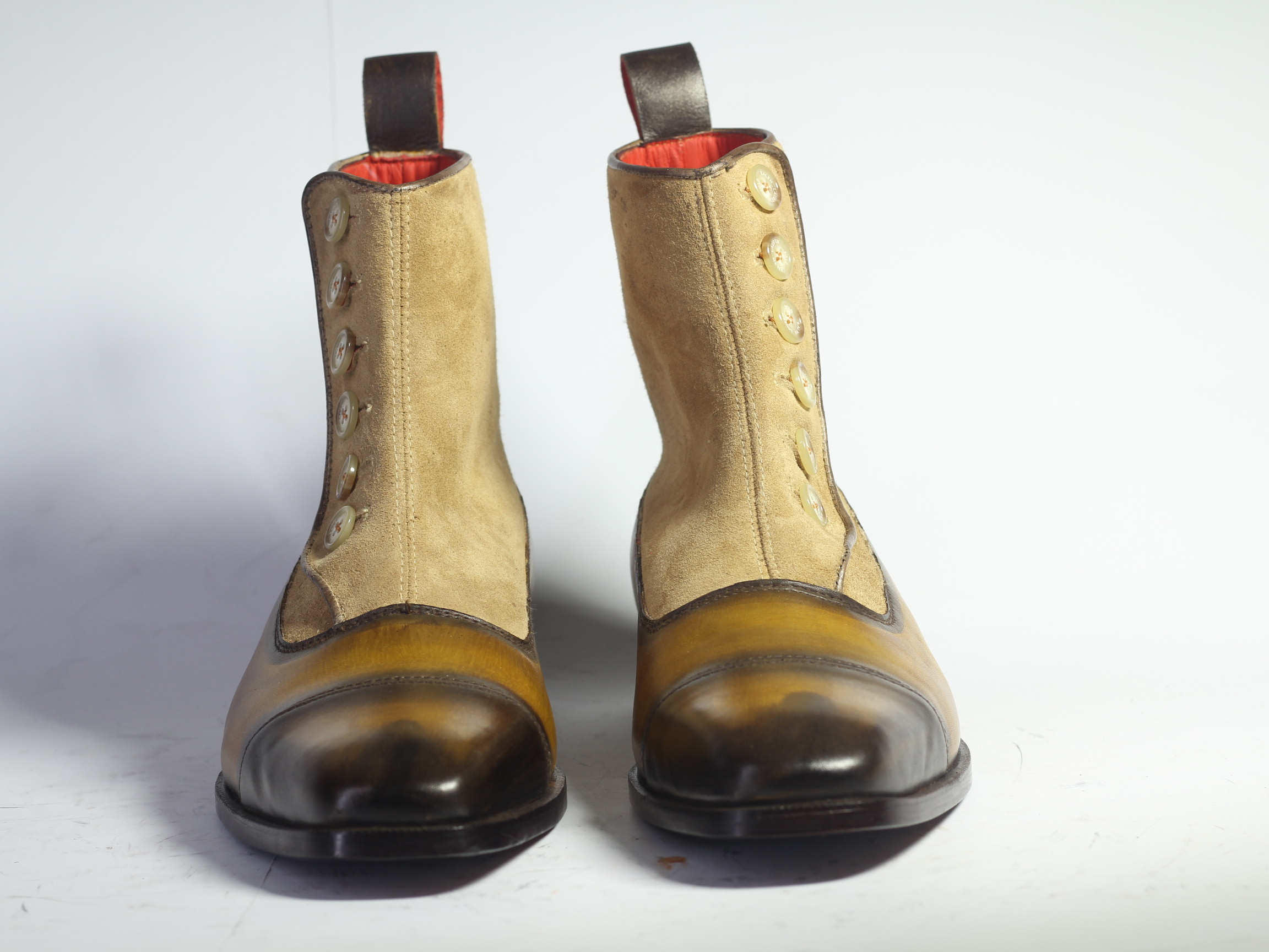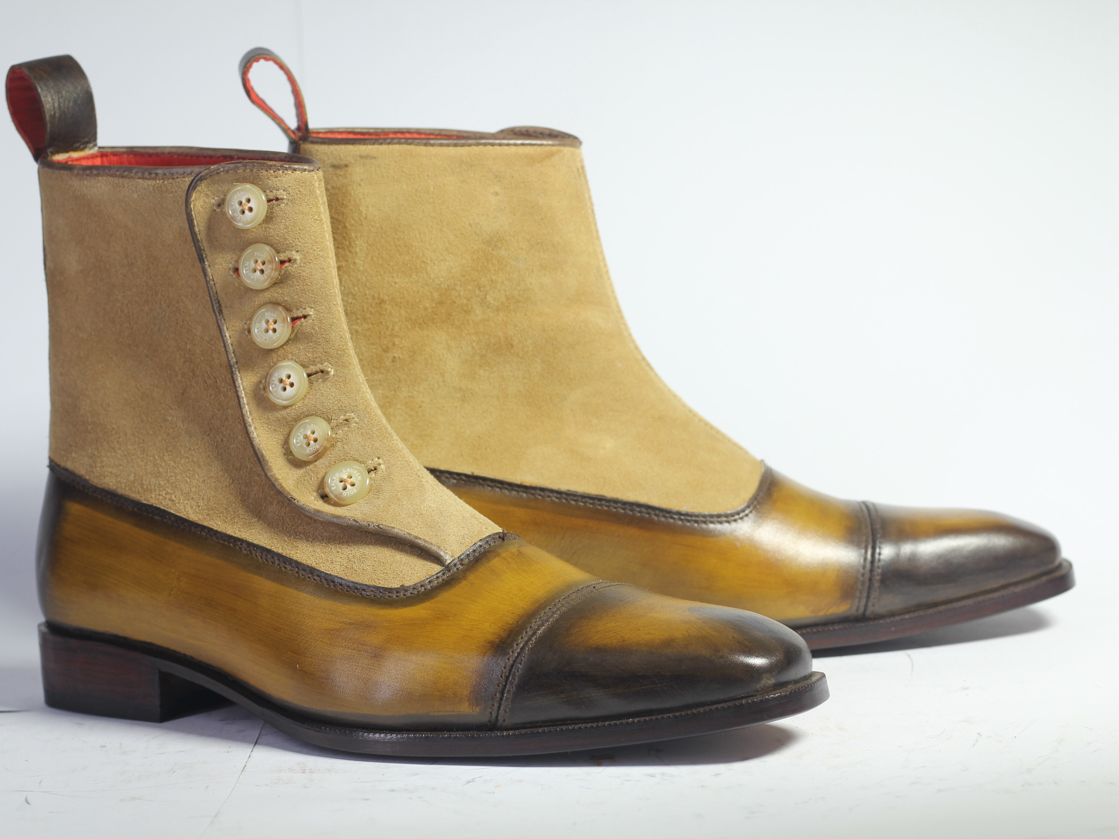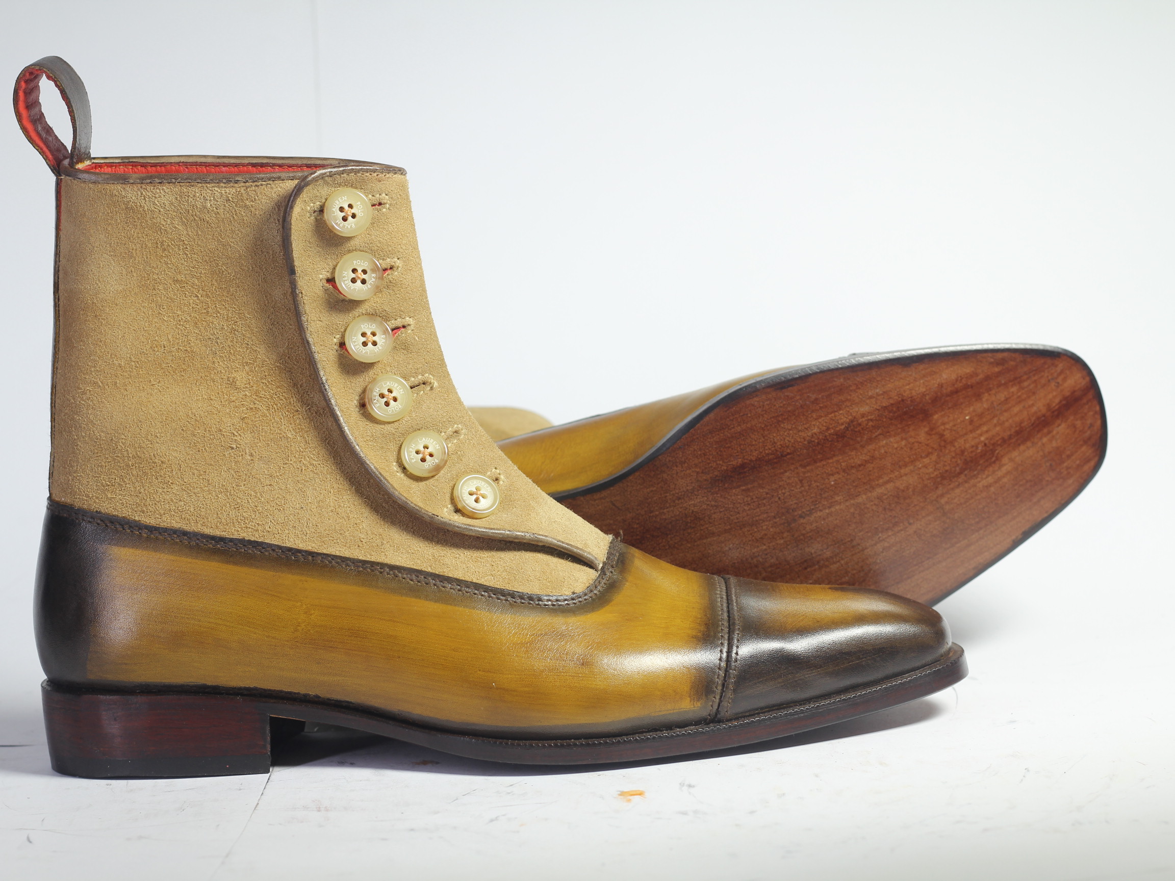 Handmade Men's Two Tone Beige & Mustard Color Leather & Suede Cap Toe Button Top Ankle High Dress Boots