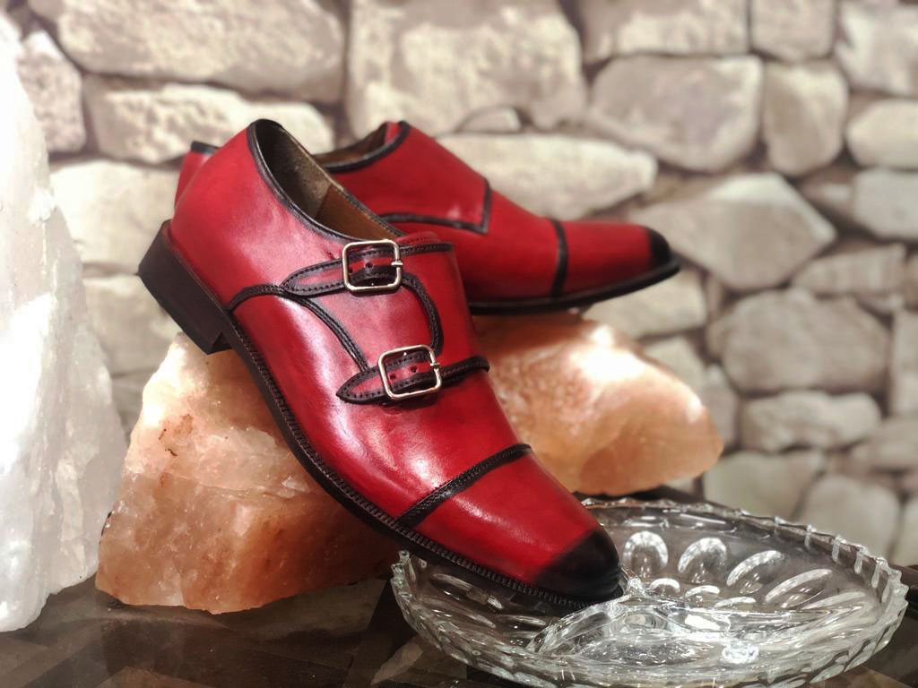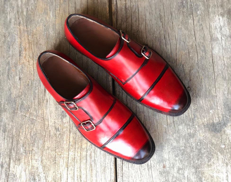 Handmade Red Color Leather Cap Toe Double Monk Strap Dress Formal Shoes For Men's
