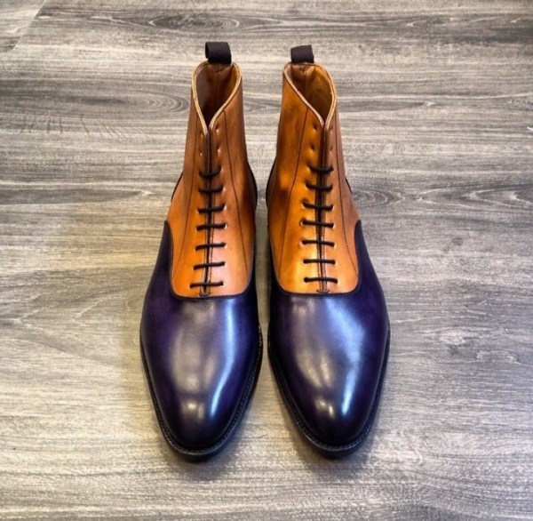 Handmade Men's Purple & Tan Ankle High Leather Lace Up Boots