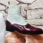 Handmade Men's Burgundy & White Ankle High Leather Suede Lace Up Boots