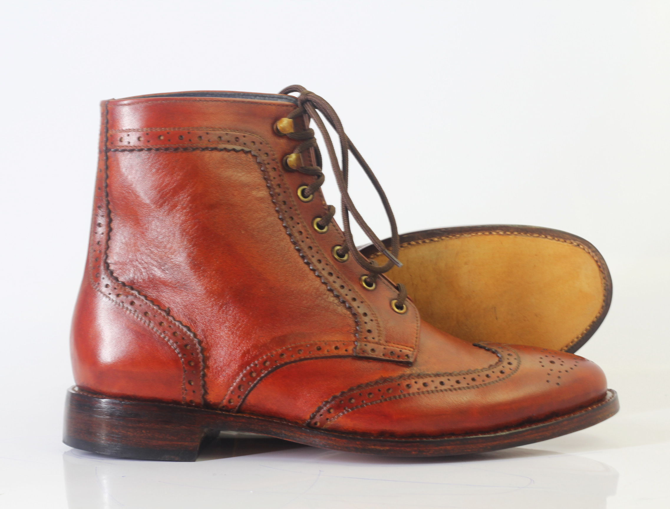 Handmade Men's Orange Wing Tip Brogue Ankle High Leather Lace Up Boots
