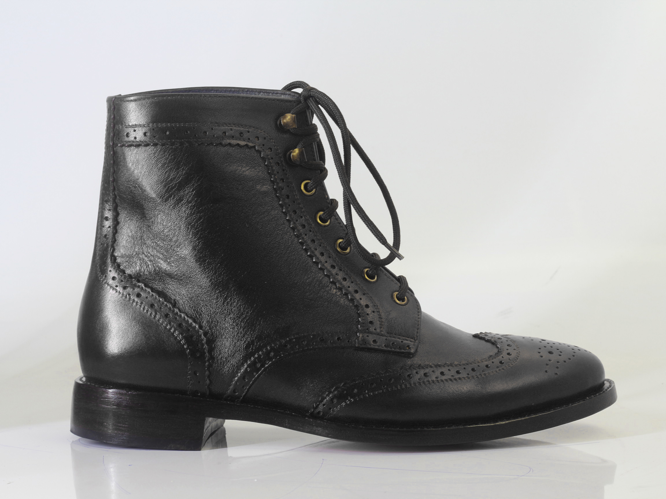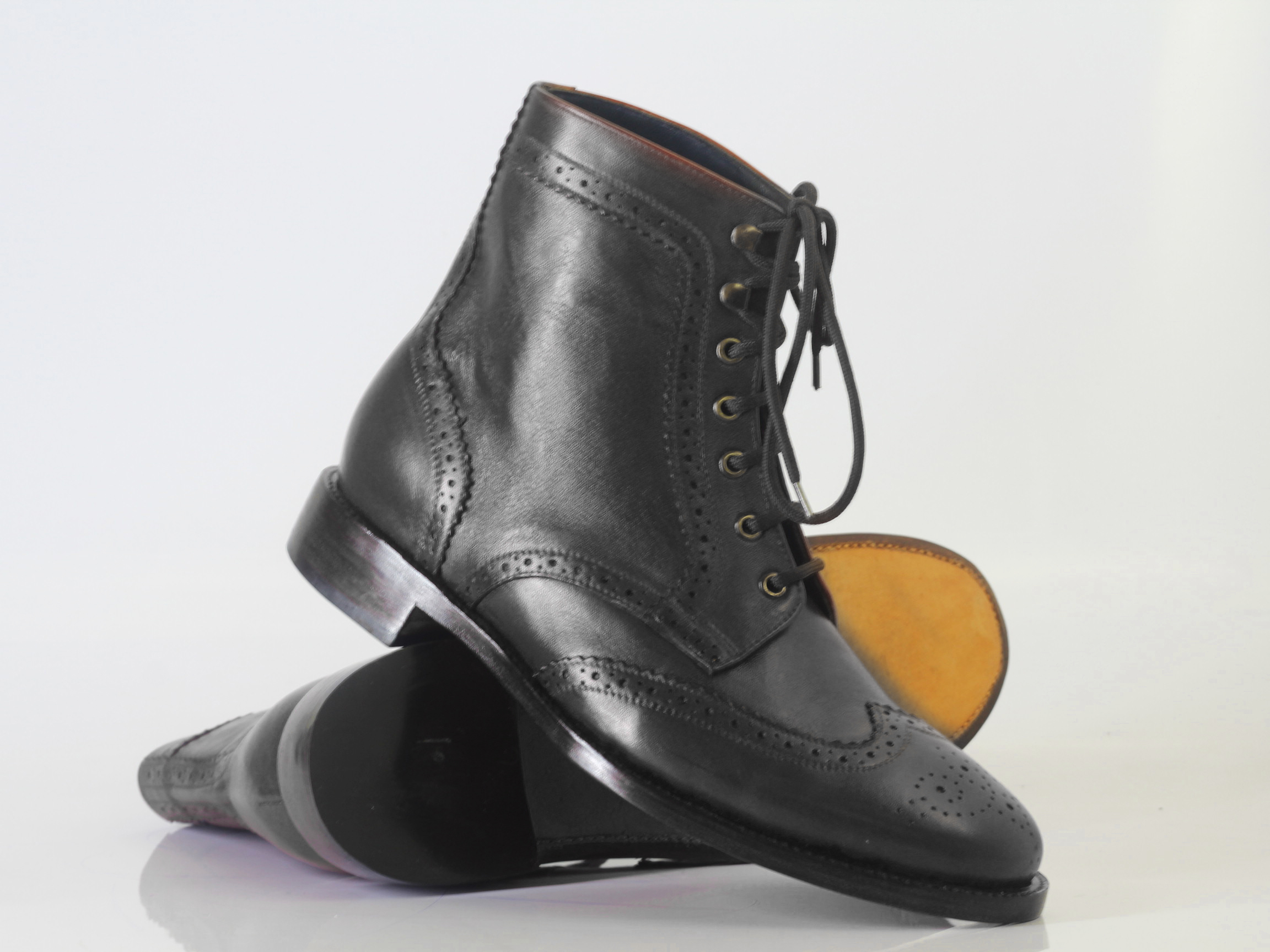 Handmade Men's Black Wing Tip Brogue Ankle High Leather Lace Up Boots