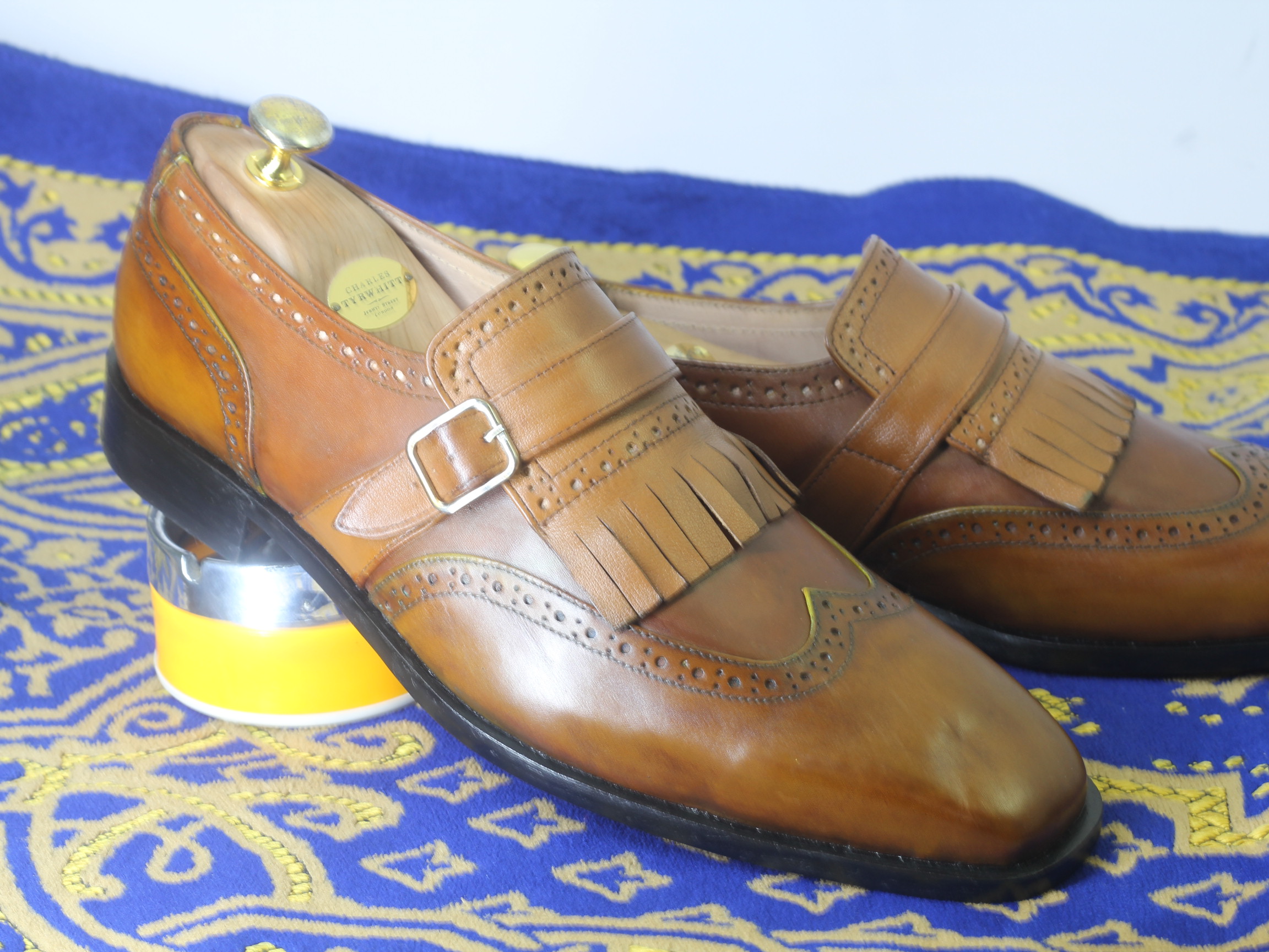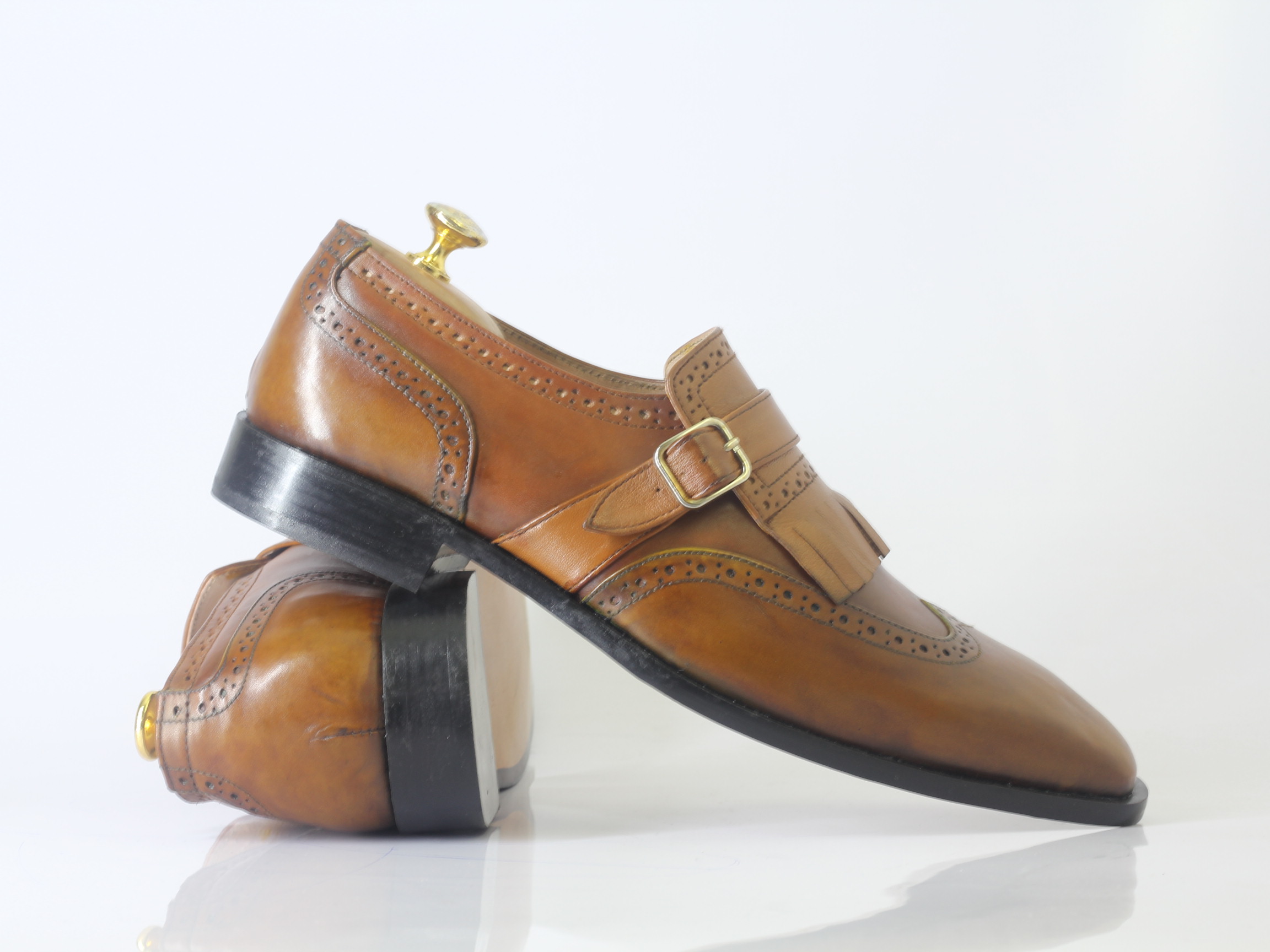 Handmade Brown Leather Fringe Wing Tip Monk strap Shoes For Men's