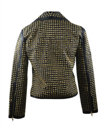 Handmade Woman Black Golden Studded Brando Style Punk Cowhide Leather Biker Jacket
