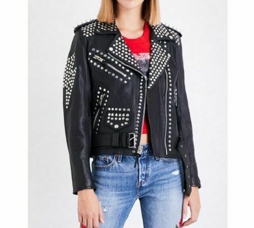 Handmade Black Fashion Studded Punk Leather Biker Jacket For Women