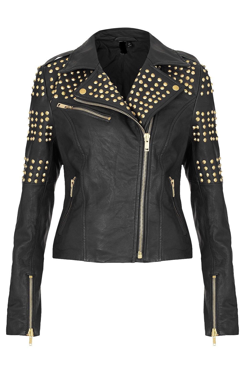 Handmade Black Women's Fashion Leather Golden Studded Jackets
