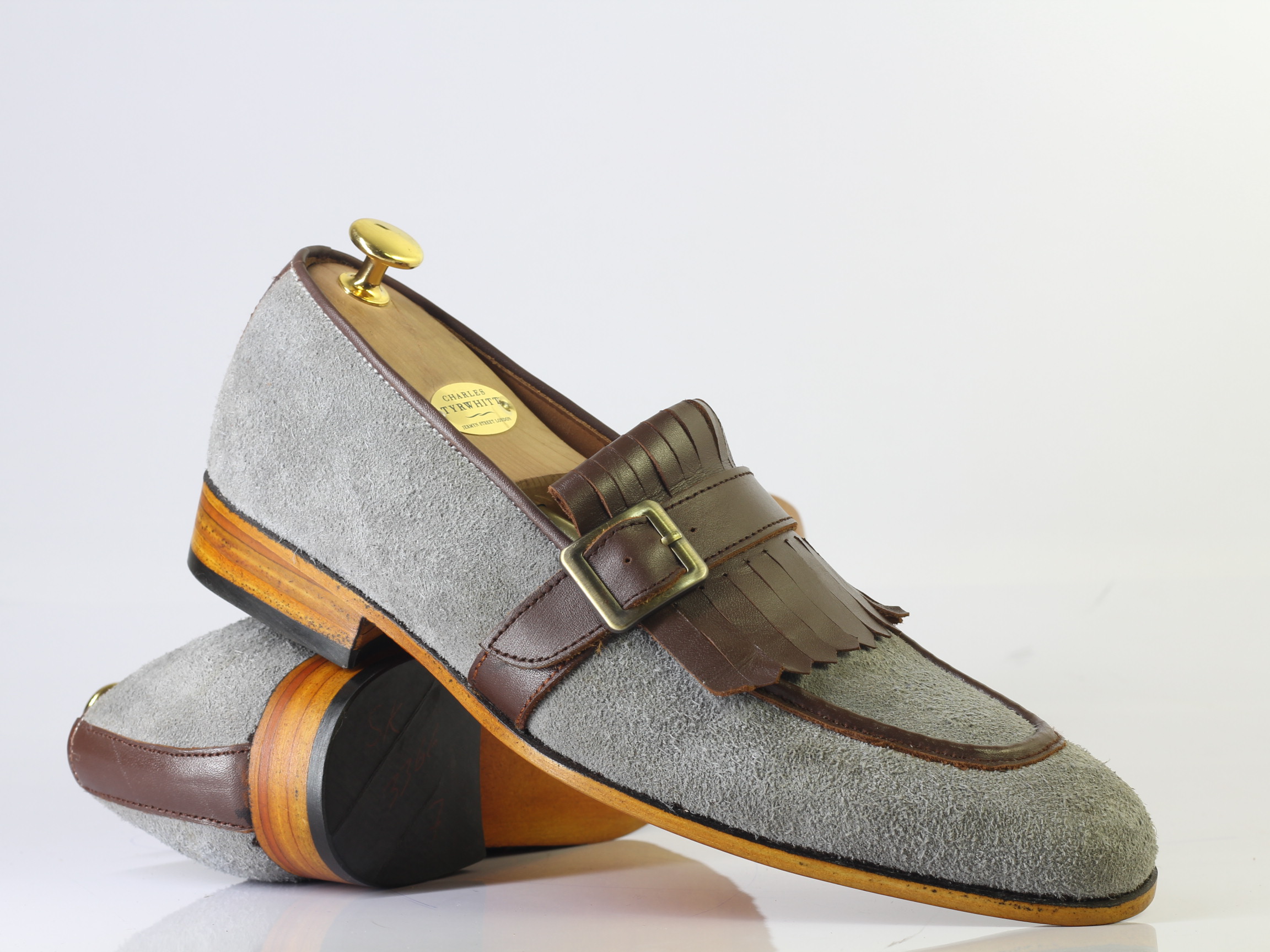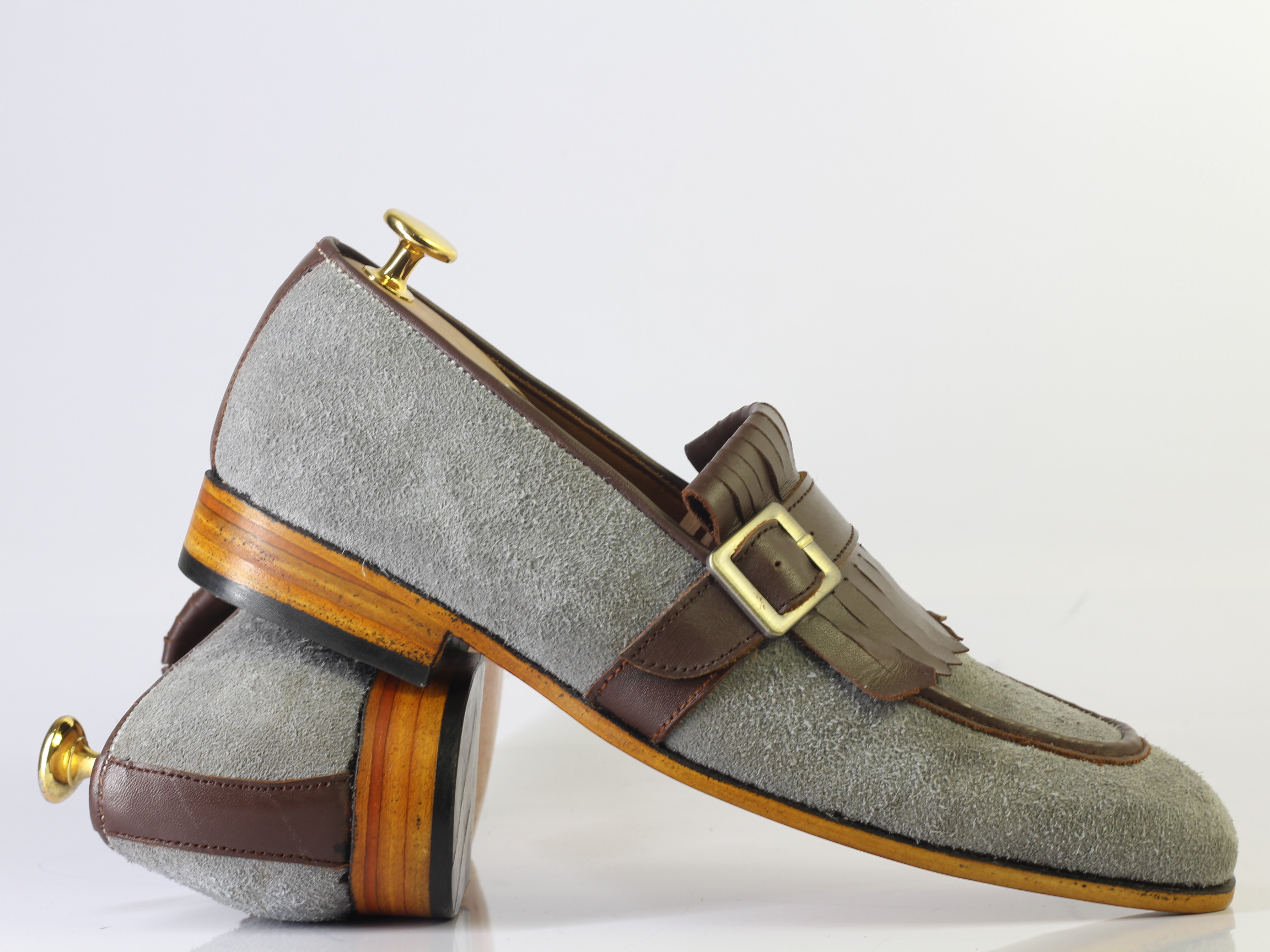 Handmade Gray Fringe Monk Strap Suede Shoes For Men's