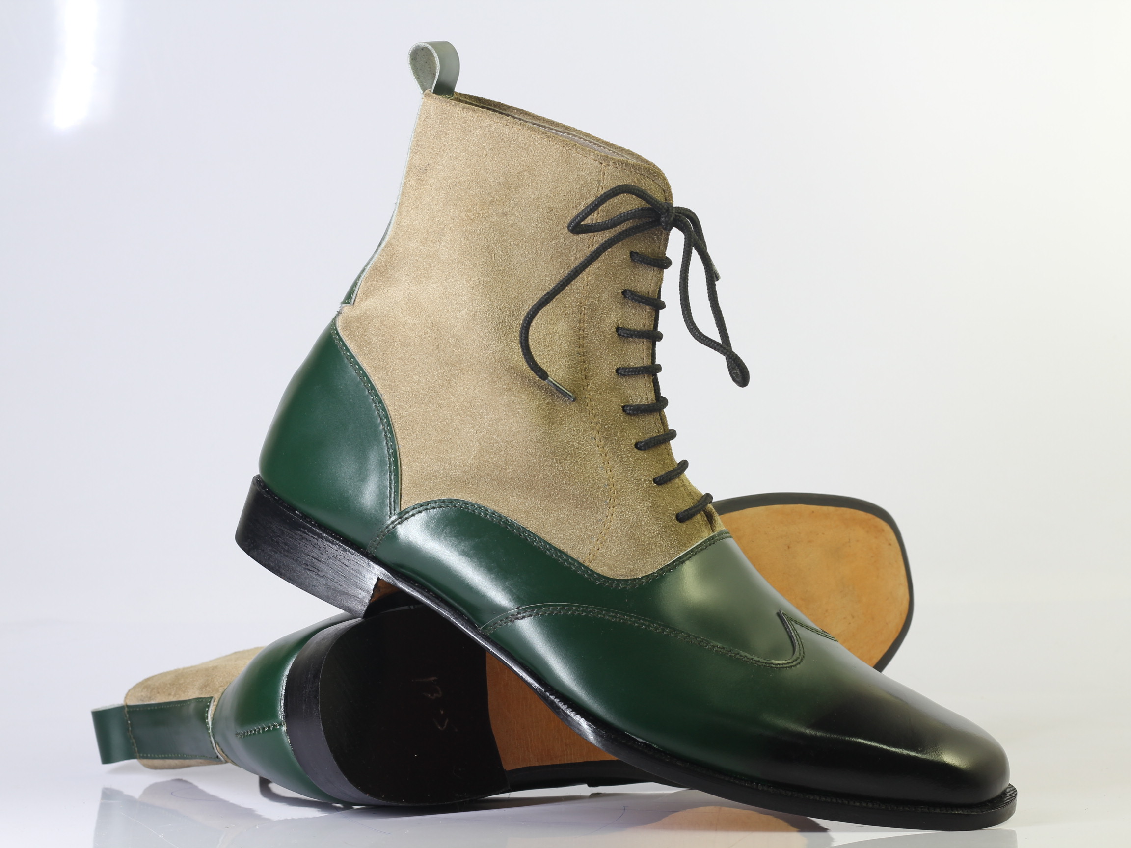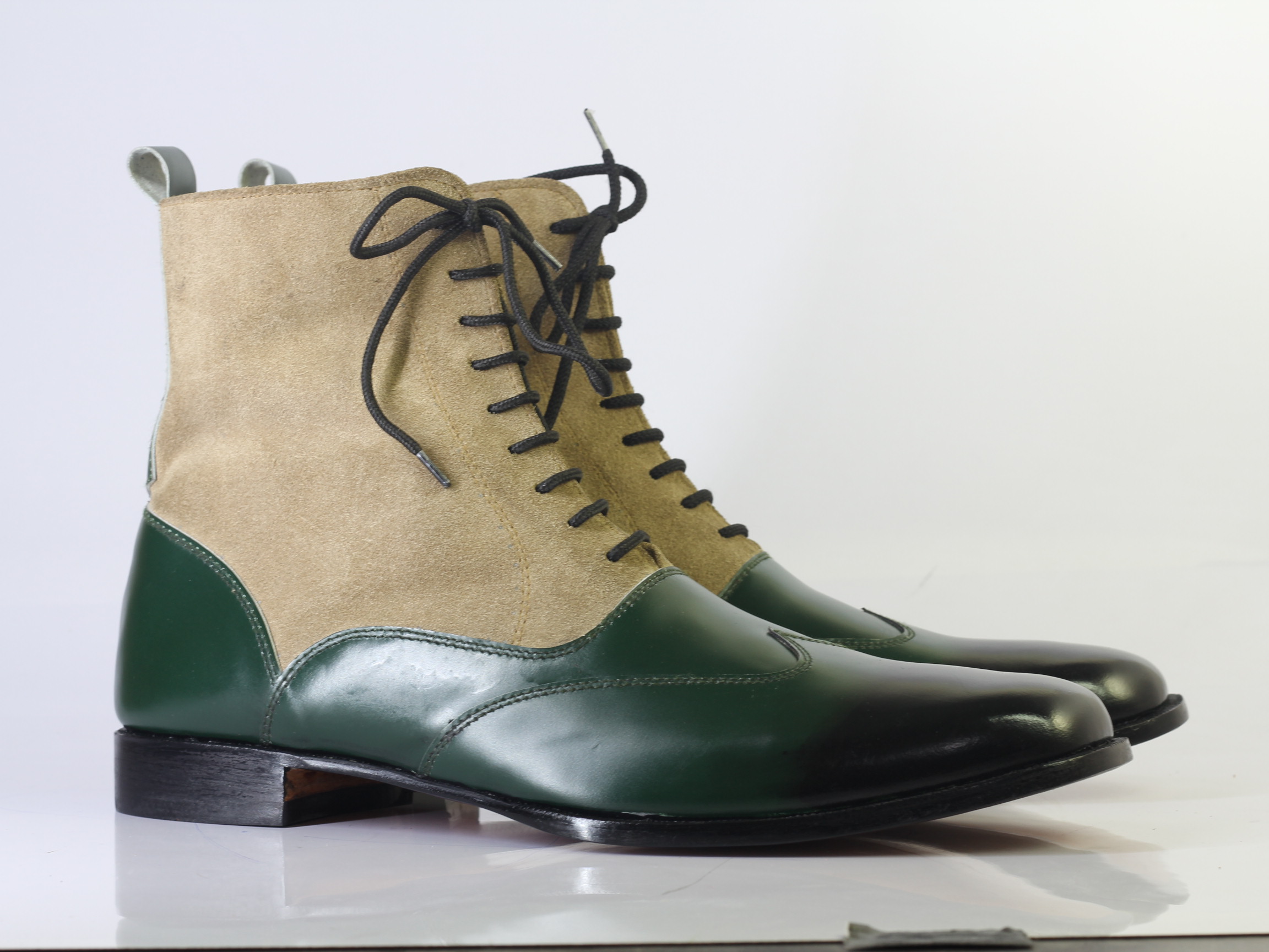 Handmade Men's Green & Beige Ankle high Leather Suede Lace Up Boots