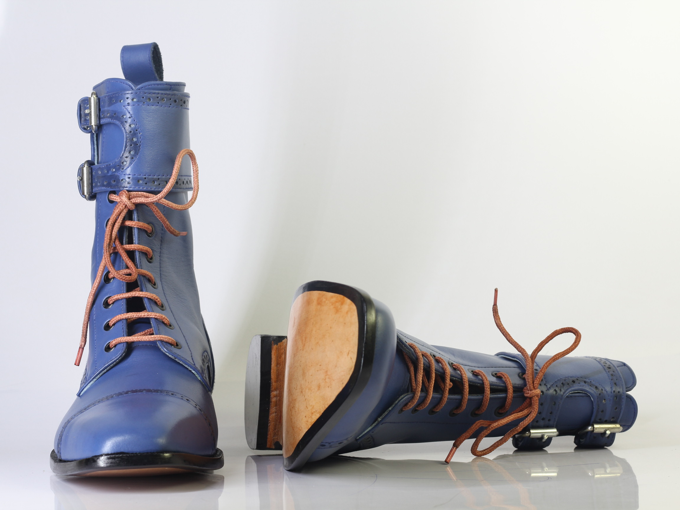 Handmade Men's Blue Cap Toe Buckle Ankle high Leather Lace Up Boots