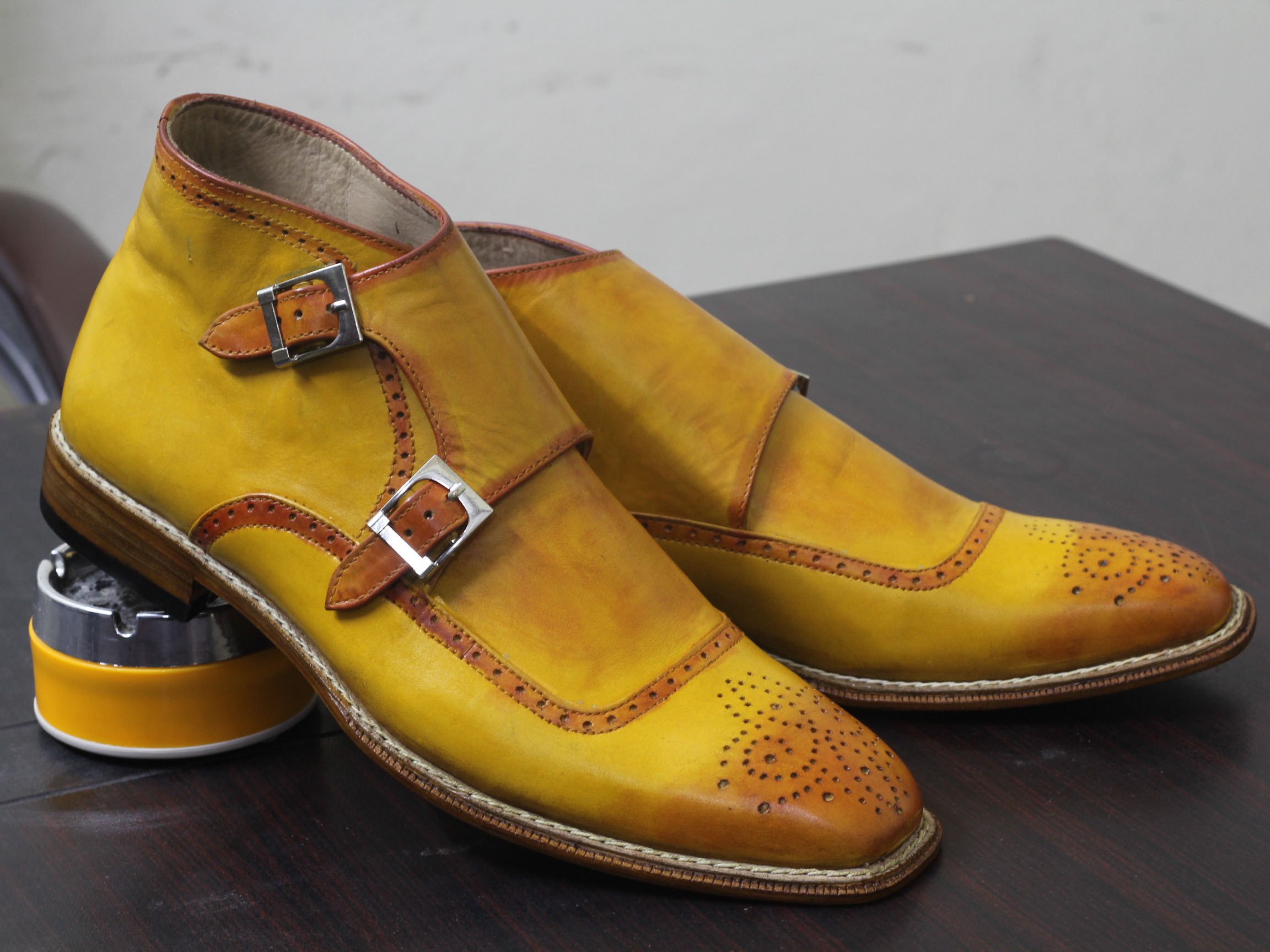 Handmade Men's Tan Double Monk Strap Ankle High Boots