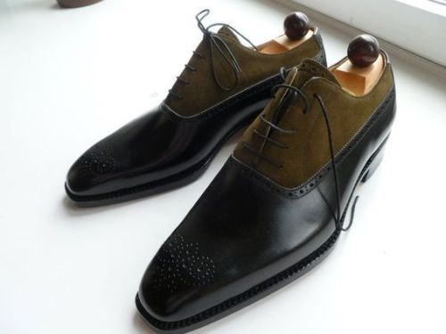 Handmade Two Tone Brogue Toe Leather Suede Lace Up Shoes For Men's