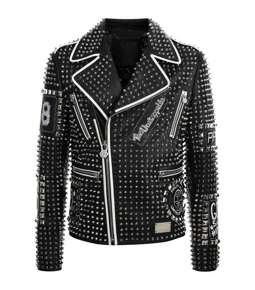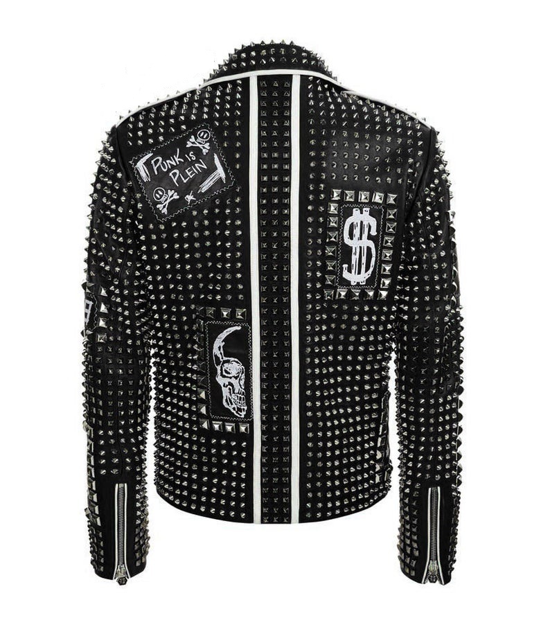 Handmade Men's Sliver Full Studded Punk Style Black Biker Rock Design Leather Jacket