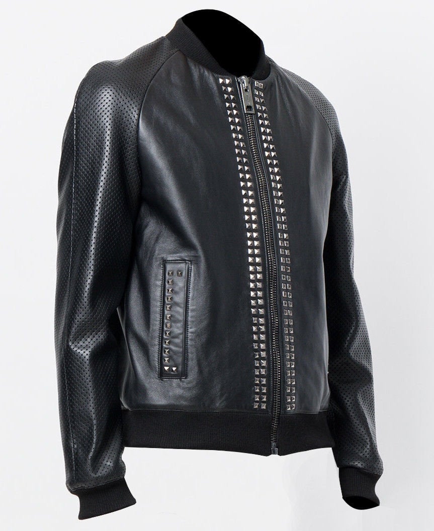 Handmade Men's Sliver Studded Zip Style Black Biker Rock Design Leather Jacket