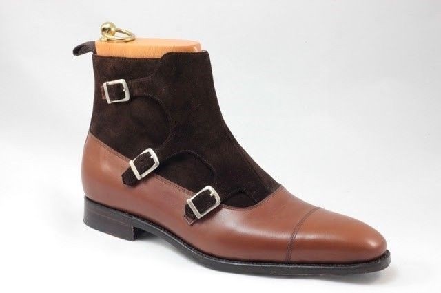 Handmade Ankle High Two Tone Leather Suede Cap Toe Three Monk Strap Boot For Men's