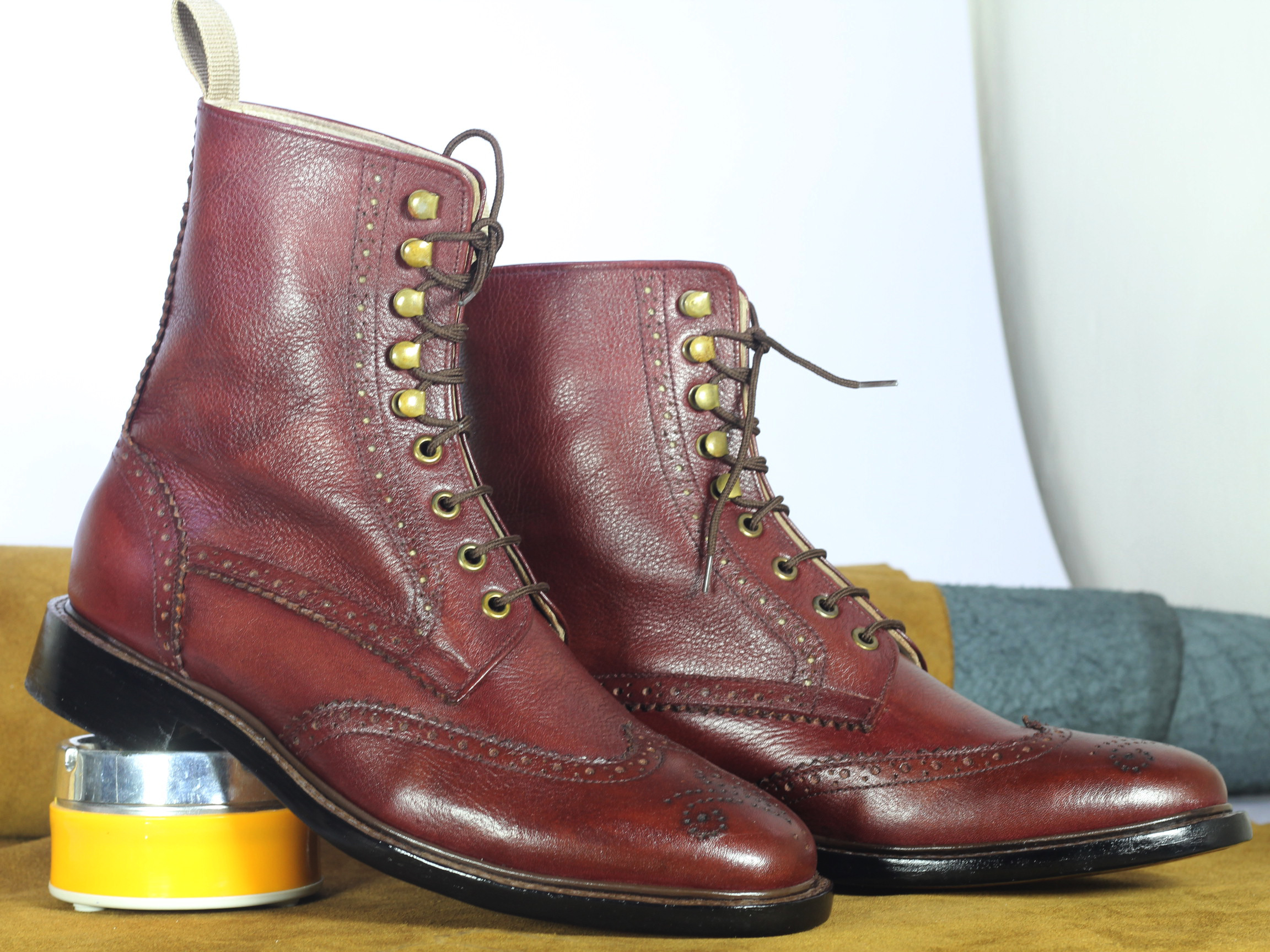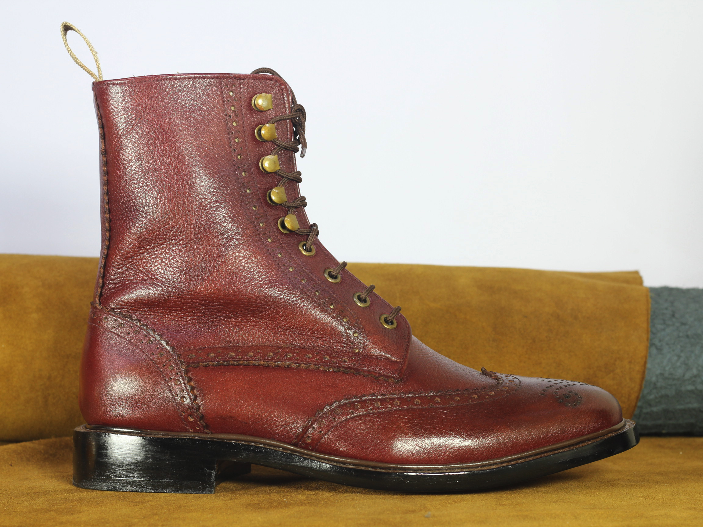 Handmade Ankle High Burgundy Wing Tip Brogue Leather Boot For Men's