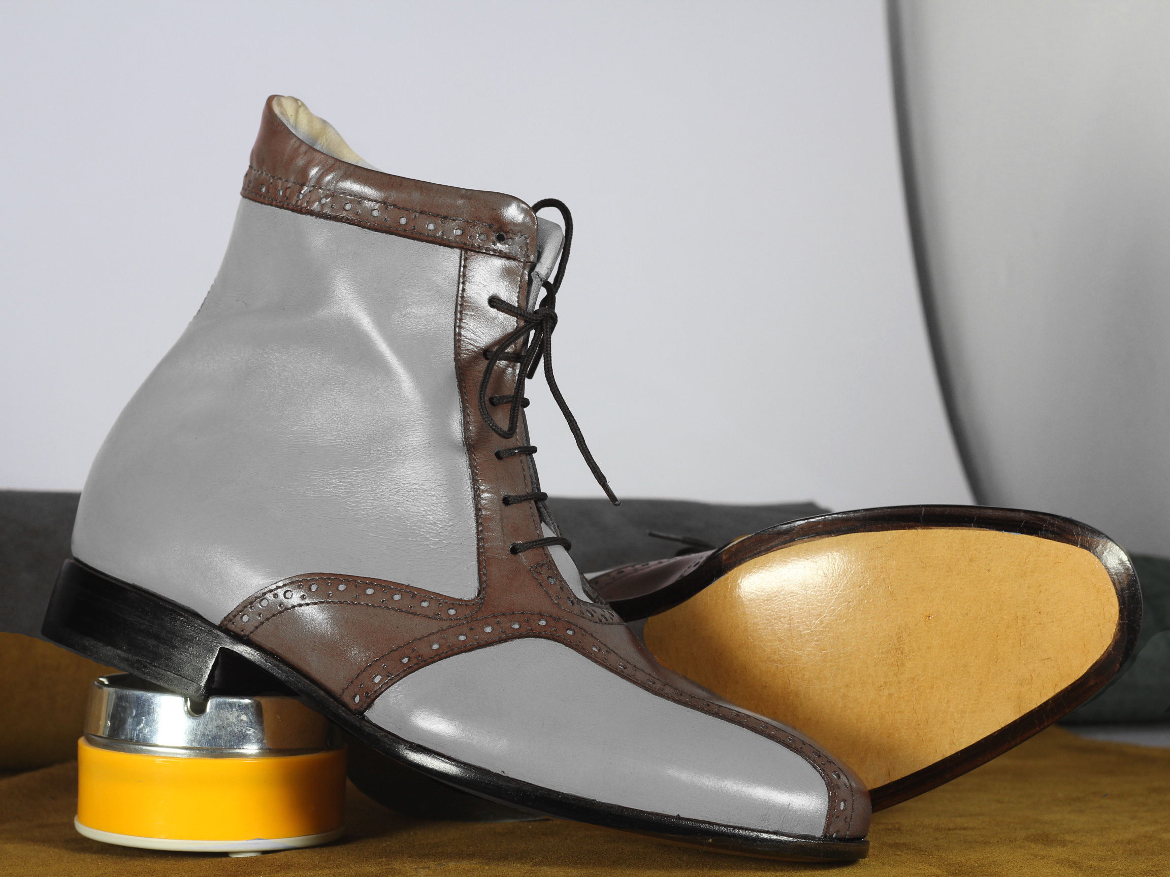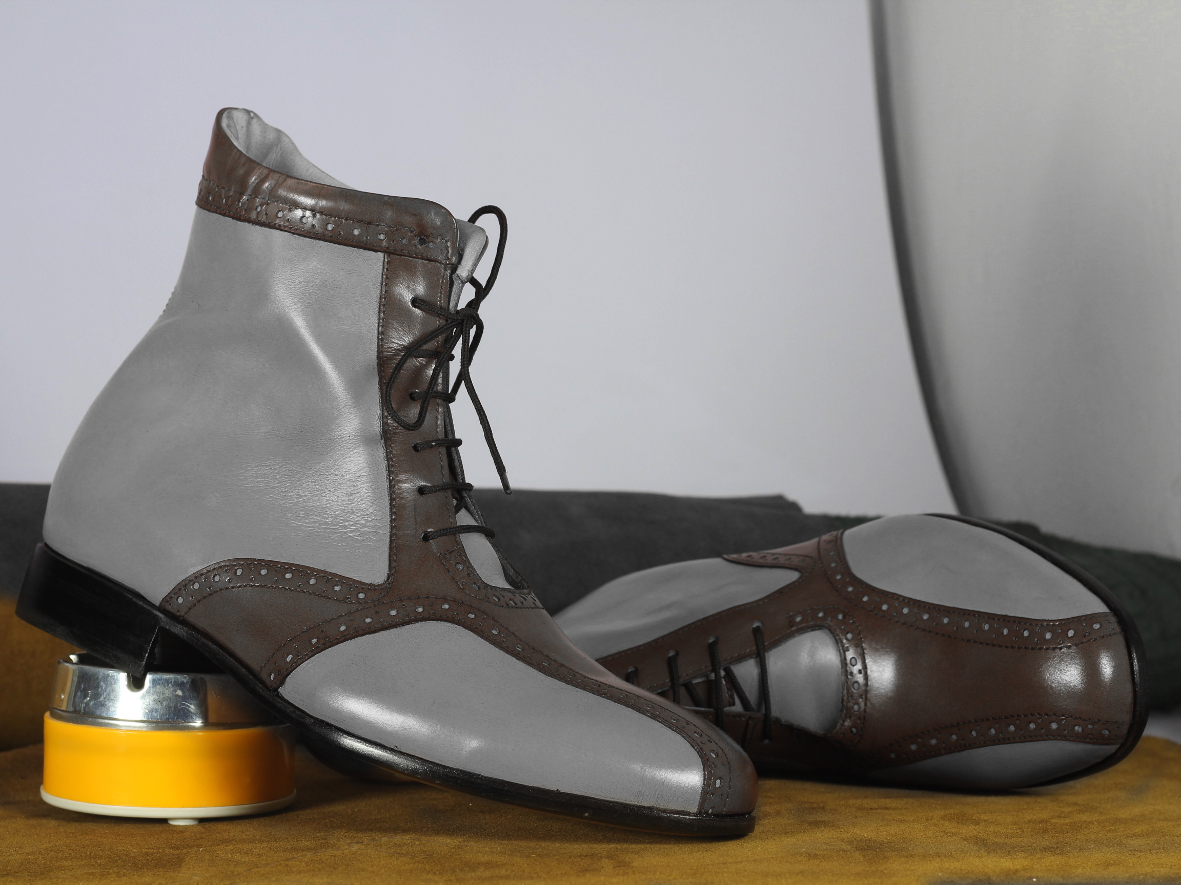 Handmade Ankle High Brown & Gray Leather Stylish Lace Up Boot For Men's