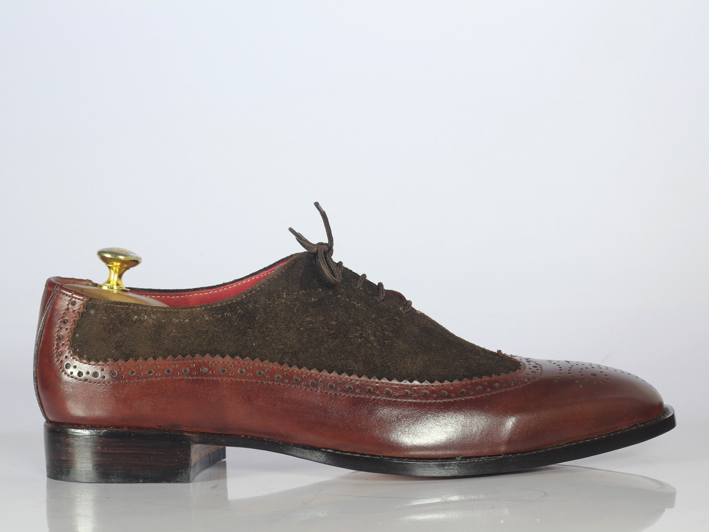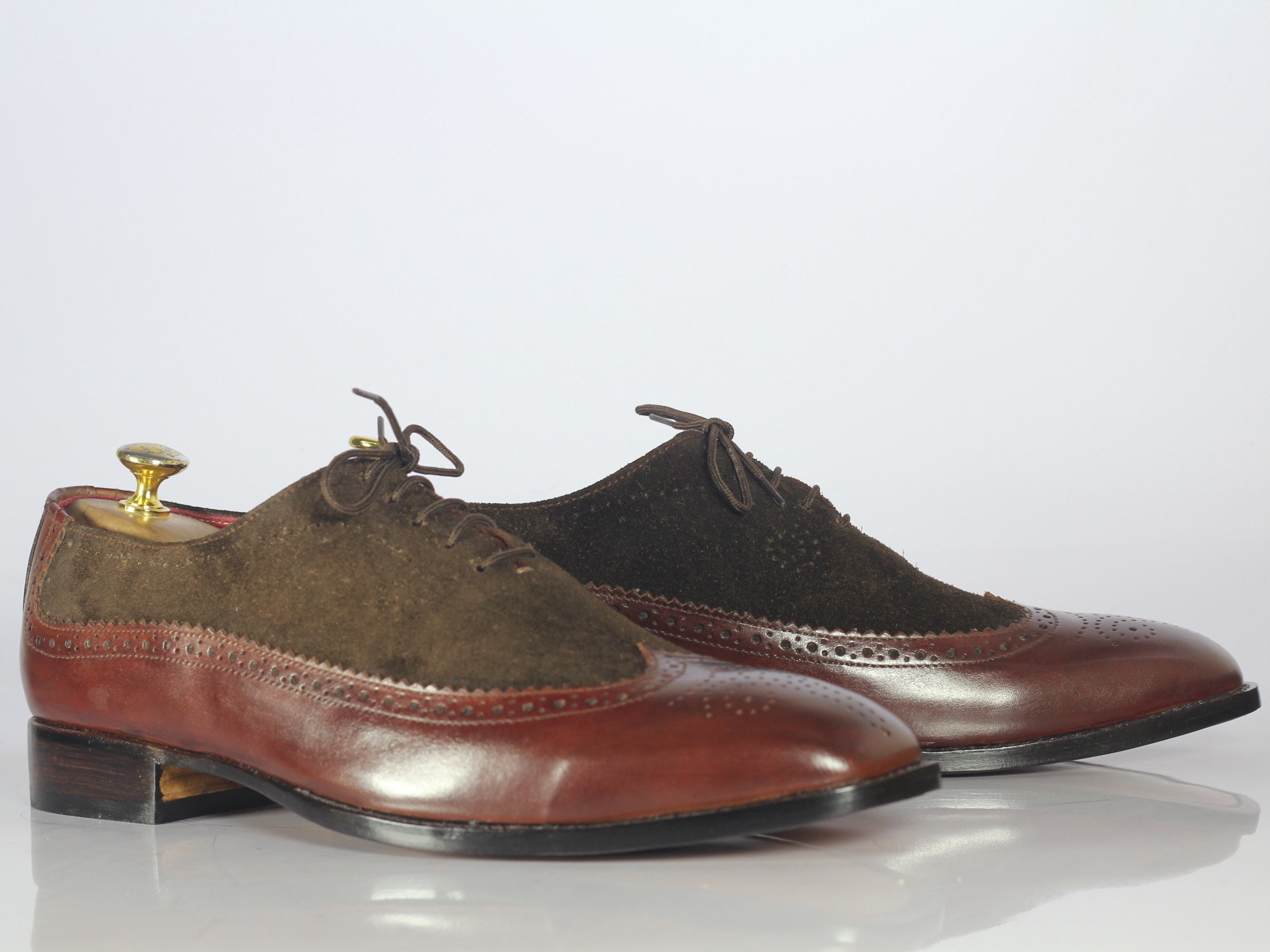 Handmade Brown Leather Suede Wing Tip Brogue Monk Strap Shoes For Men's