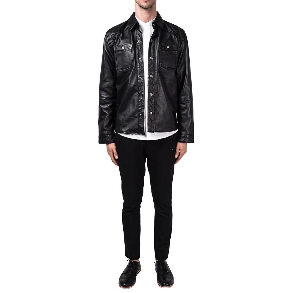 Handmade Men's Black Lambskin Leather Collared Lightweight Jacket Shirt