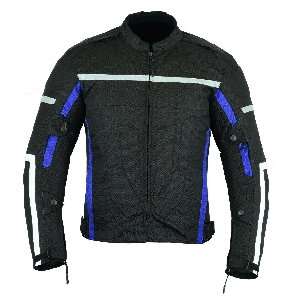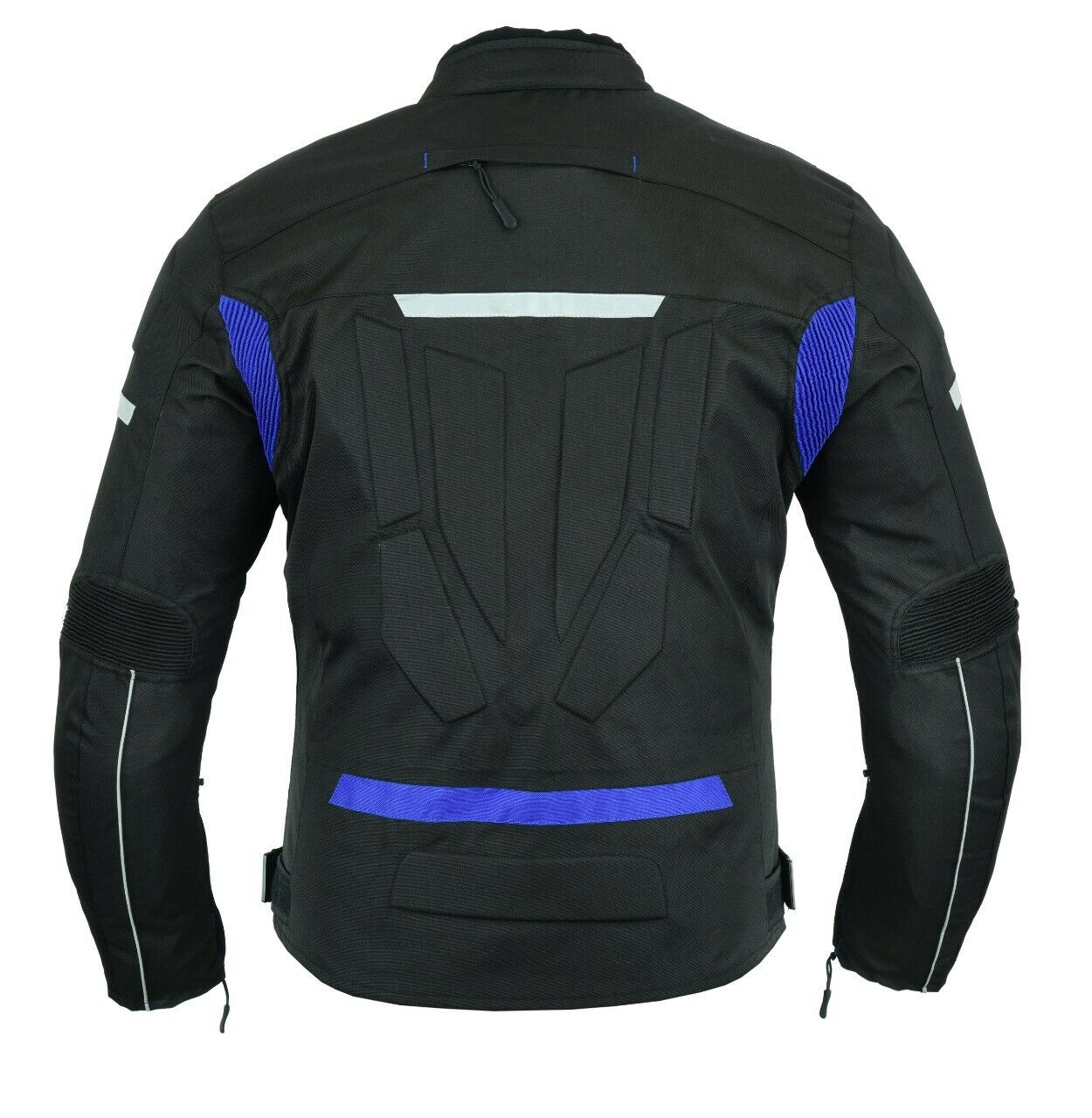 Handmade Men's Black Leather Armored Motorcycle Racing Blue & White Strips Protection Jacket