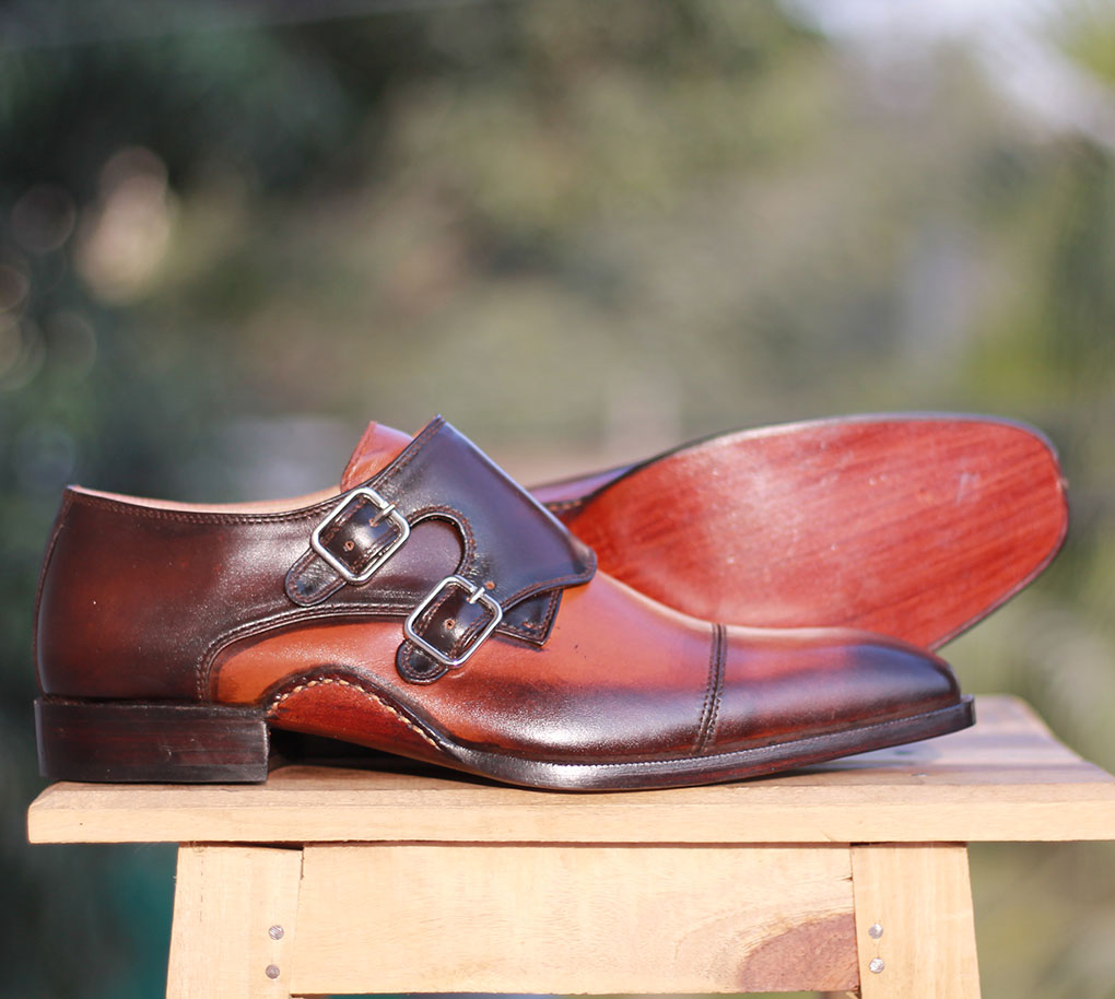 Handmade Tan Brown Leather Stylish Shoes, Men's Cap Toe Double Monk Formal Shoes