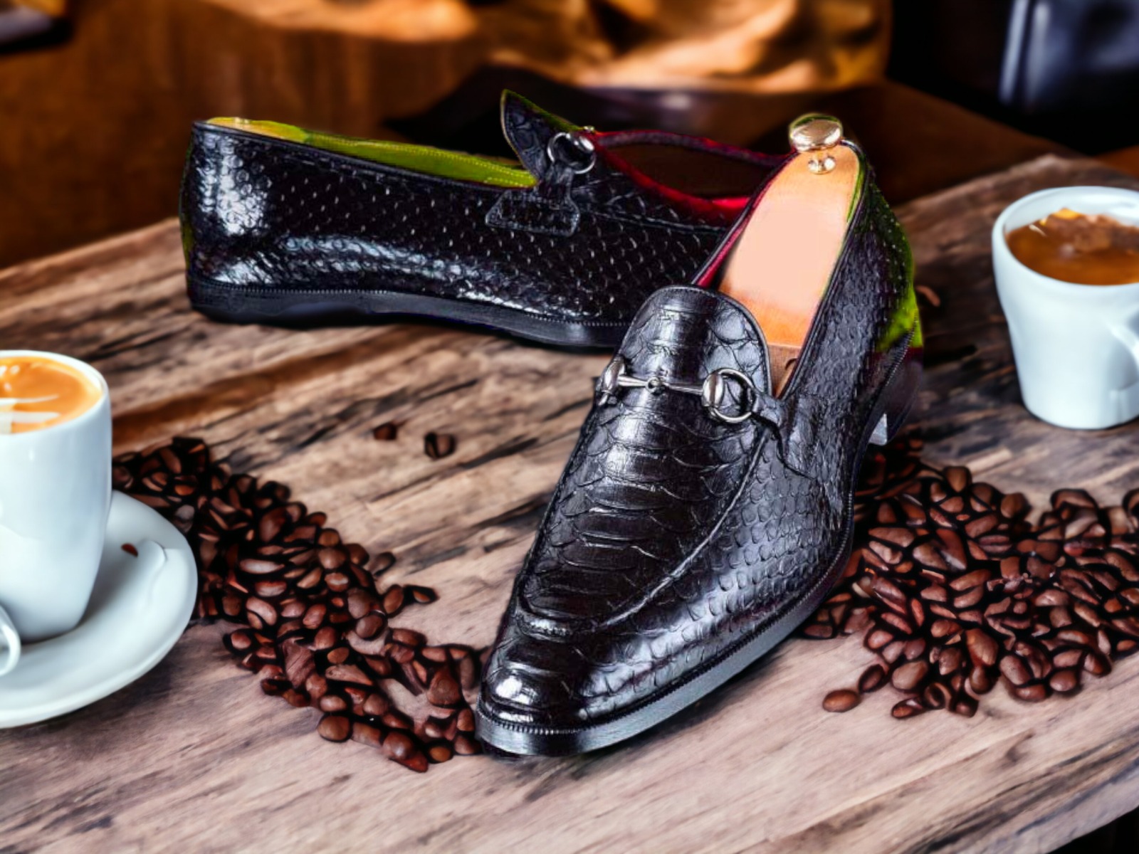 Men's Handmade Python Texture Leather Horse Bit Style Black Colour Penny Loafer Shoes