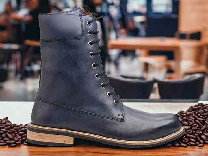 Men's Ankle High Navy Blue Long Leather Boot, Hand Painted Boot