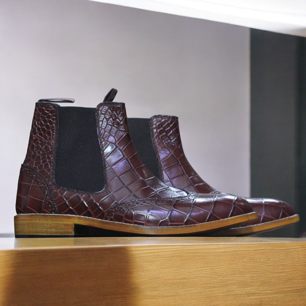 Handmade Ankle High Brown Chelsea Alligator Print Leather Boot For Men's